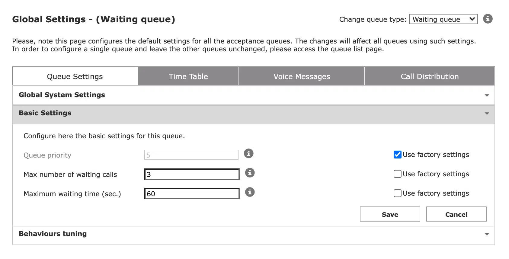 In a queue’s settings (or default settings) under “Behaviours Tuning”, you can set a Maximum Waiting Time (e.g., 300 seconds). Then define an overflow treatment: after this wait time expires, play a message and transfer the caller to a voicemail number (or hang up). That way, callers are not left waiting forever.