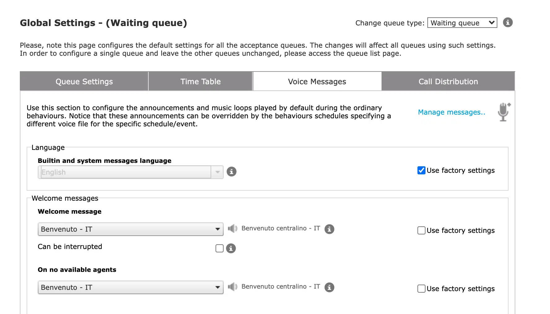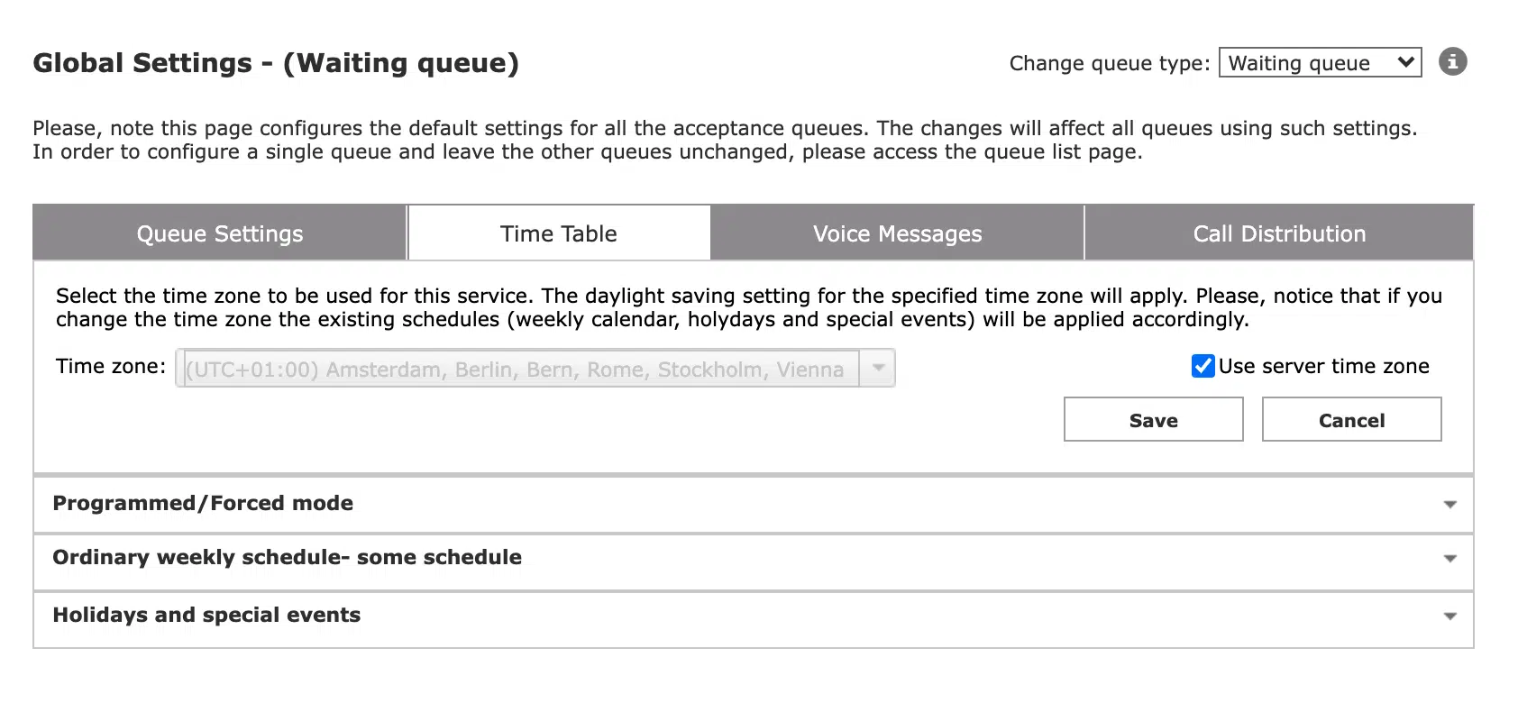 In the web portal, go to Advanced Queueing → Default Settings. Here you can define values that apply to all queues (unless overridden): login/logout toggle number, retention period for CDRs, maximum waiting time, behaviours for overflow/no agents, time tables, voice messages, and call-distribution tuning (e.g., wrap-up time, sticky agent). When a queue is created it inherits these settings by default, and you can choose to override specific parameters for that queue.