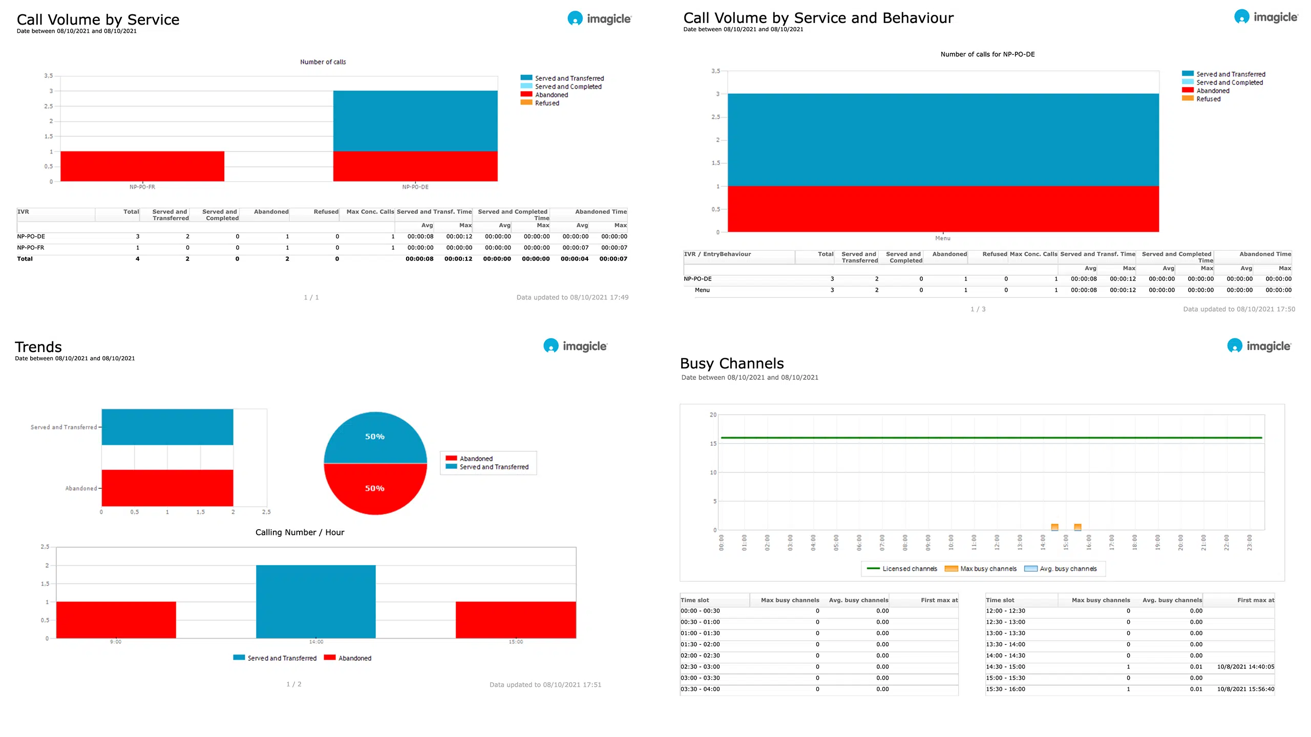 In the web portal, you can see number of incoming calls, menu selections, abandoned calls, busy-channel events, peak hours and call outcomes. Reports can be exported or scheduled via email to track performance over time and identify menu improvements.