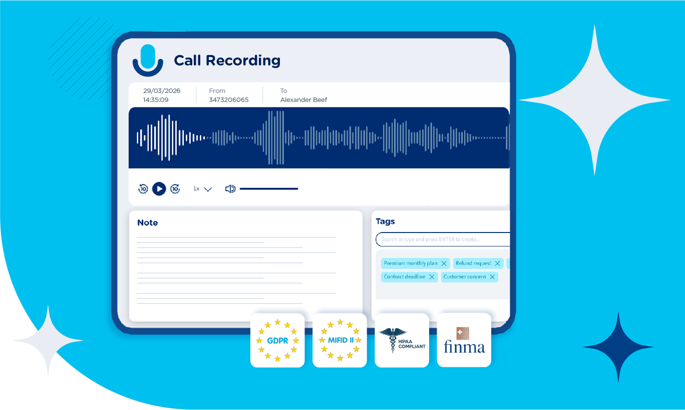 Reduce compliance risk, prevent fraud, and avoid costly penalties with secure call recording and built-in compliance features. Meet security regulations such as GDPR, MiFID II, PCI-DSS, and HIPAA with no headaches.